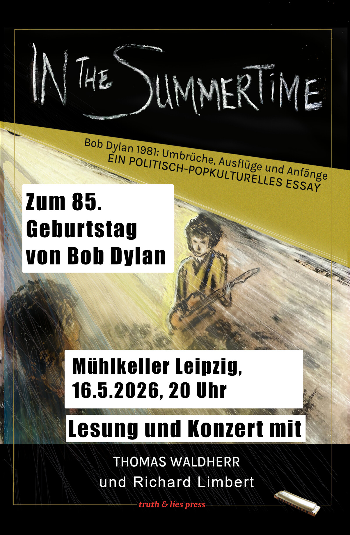 Dies alles bringt Waldherr in seinem Buch zusammen, aus dem er ausgewählte Passagen vorlesen wird. Außerdem gibt es einen Teil zu Bob Dylans einzigem DDR-Konzert: Ostberlin 1987. Musikalisch begleitet wird er dabei von dem Leipziger Singer-Songwriter Richard Limbert, der Dylan-Songs aus dieser Zeit, aber auch andere Stücke der Musiklegende vortragen wird. Ein intensives, tiefgehendes und unterhaltsames Hörerlebnis rund um den US-amerikanischen Ausnahmekünstler.